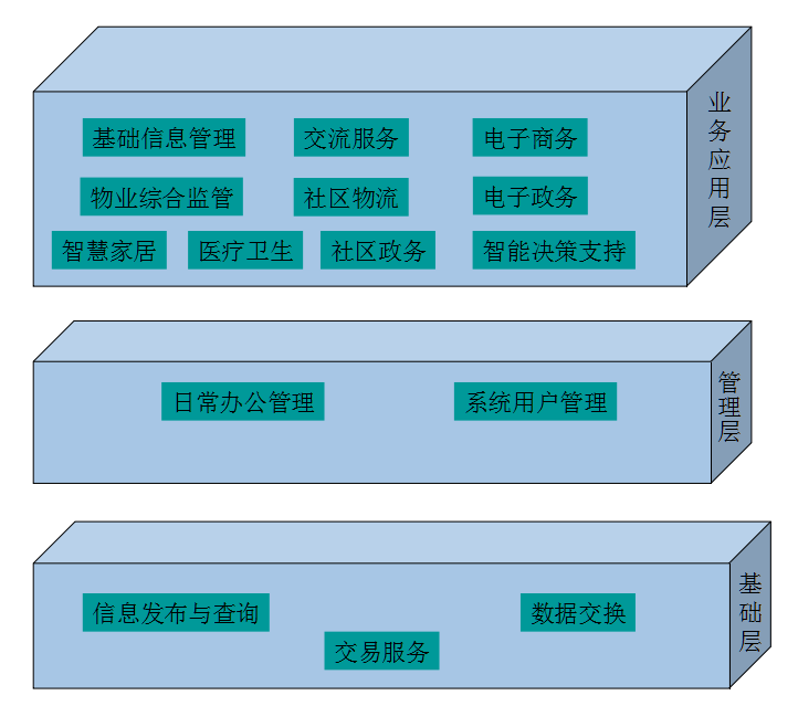 在物联网应用环境下,可将智慧社区服务系统的功能需求可概括为以下三个层次基础层、管理层、业务应用层。