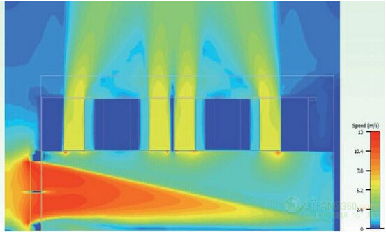 在进气口的垂直方向上安装过滤器也不是一个选项,因为从一个相对较小的进气口通过或减少进气入口的横截面会造成较高的空气流通速度。通过过滤器的压力下降将要求高性能的风扇。此外,过滤器会更迅速的堵塞,因为减少了过滤面积。在我们的模拟中,我们专注于通过过滤器实现空气的压力下降和均匀分布。