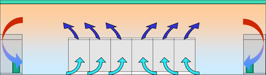 冷空气由空调下部送出,在地板平面流动,依据流体力学原理,冷空气分布在机柜的中部和下部,在机柜的周围形成冷空气的“包围”,空气受热上升,在房间内依靠“热动力”流动。计算机机柜在底部吸入冷空气,计算机或机柜本身的强制通风设备完成空气的循环,受热的空气由机柜上部排出。
